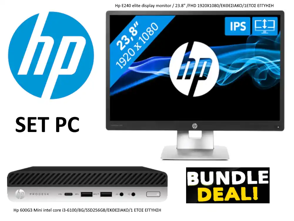 Bundle Set Pc (Hp ProDesk 600 G3 mini (Intel Core i3-6100/8G/256GB/Windows 10 Pro)+Οθόνη 24″ E240) GRADE A